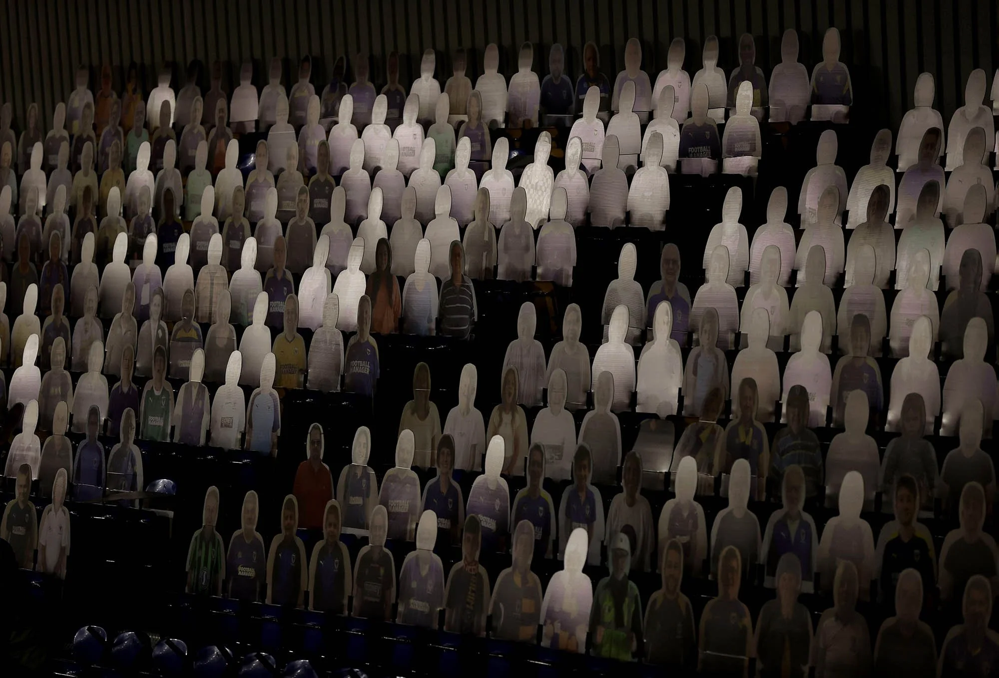 Cardboard cutouts of AFC Wimbledon fans at the first match, against Doncaster, at their new stadium. London, November 2020