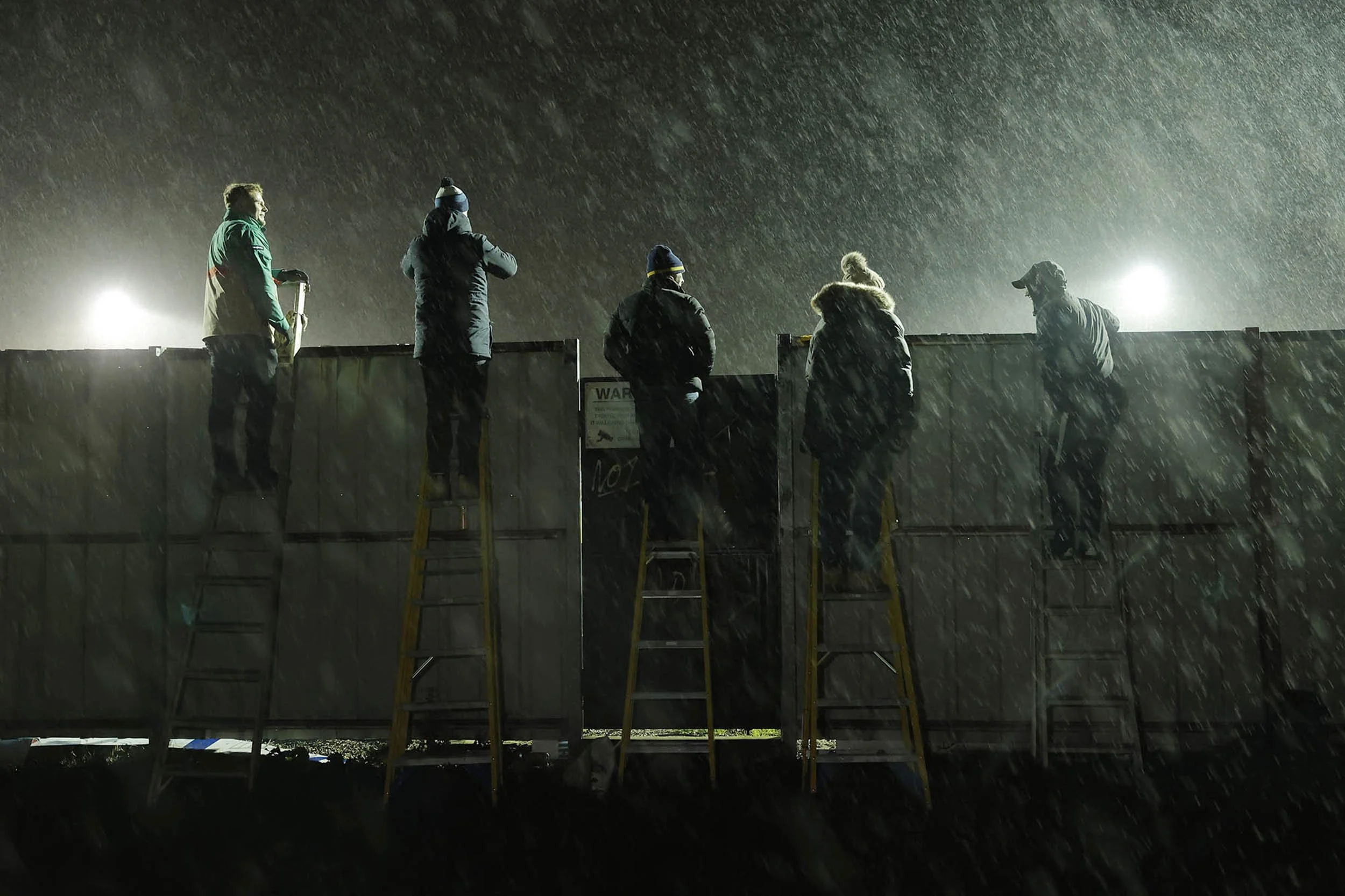 Canvey Island supporters watch their team play their biggest ever game, an FA Cup second-round match against Borehamwood, from ladders overlooking the away end. Essex, November 2020