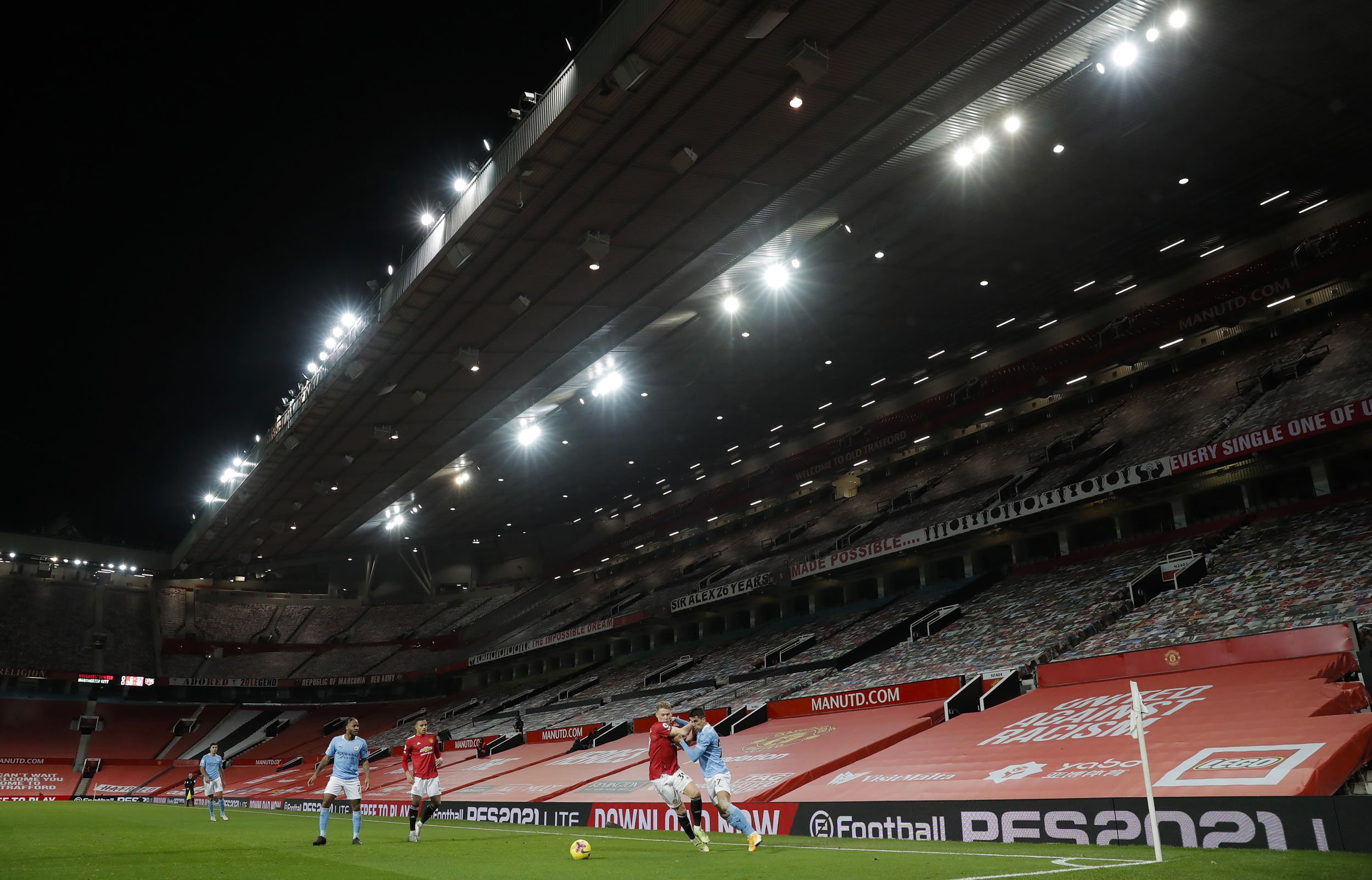 Joao Cancelo takes on Scott McTominay in front of the empty Sir Alex Ferguson stand during the Manchester United v Manchester City game at Old Trafford. Manchester, December 2020