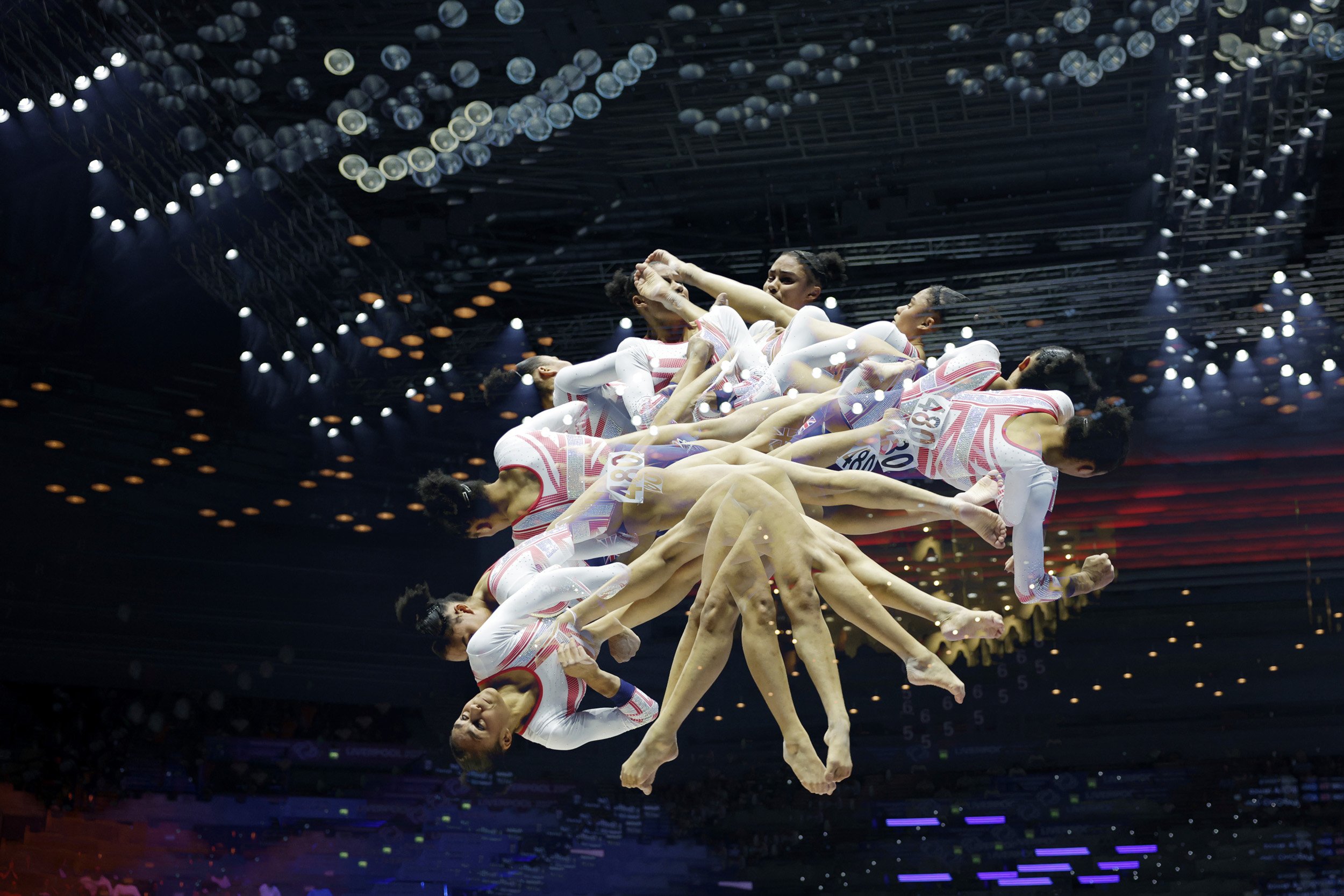 A multiple exposure showing Ondine Achampong of Great Britain competing on the vault during women's qualifications at the World Artistic Gymnastics Championships. Liverpool, October 2022