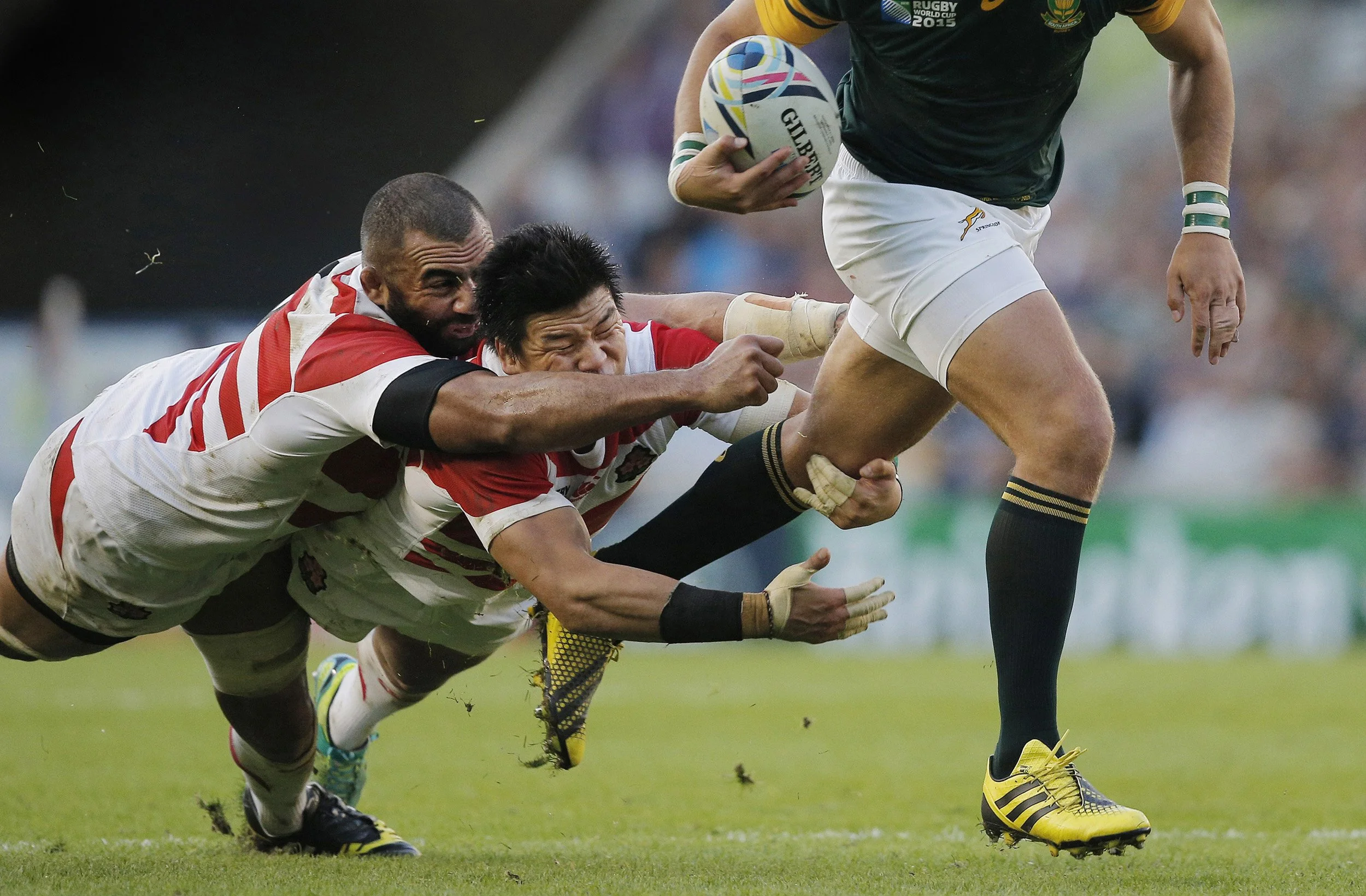 Michael Leitch and Fumiaki Tanaka of Japan attempt to stop Handre Pollard during the South Africa v Japan Pool B Rugby World Cup match at Brighton Community Stadium. Brighton, September 2015