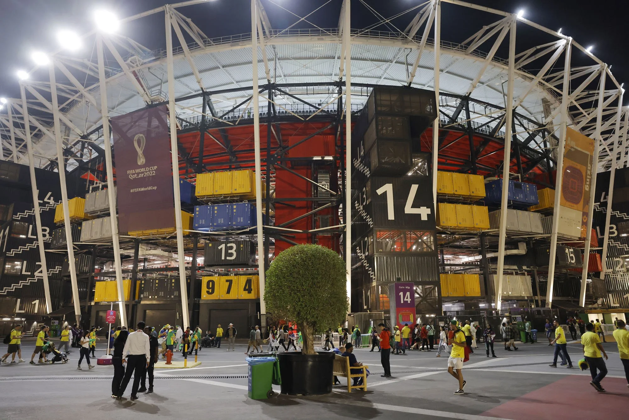 The exterior of Stadium 974, pictured before the last sixteen match between Brazil and South Korea. So named because it was built from 974 shipping containers, the stadium represented Qatar's supposed commitment to the environment. The structure was also supposed to be temporary, with the plan being to donate it to a poorer country in either South America or Africa. As of November 2025, Stadium 974 remains in Qatar