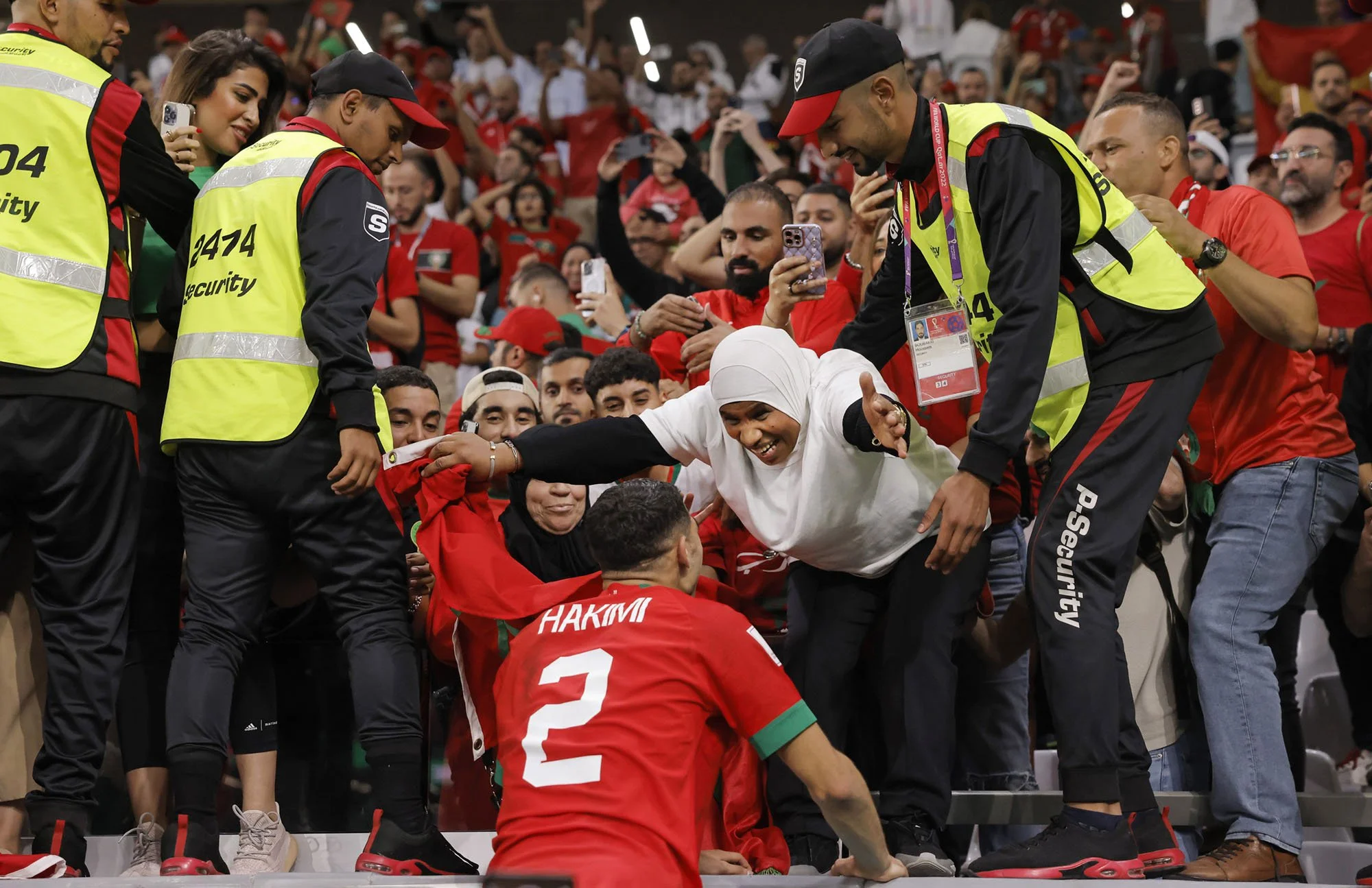 Achraf Hakimi, having scored the winning penalty for Morocco, is greeted by his mother following their last sixteen match against Spain at Education City Stadium